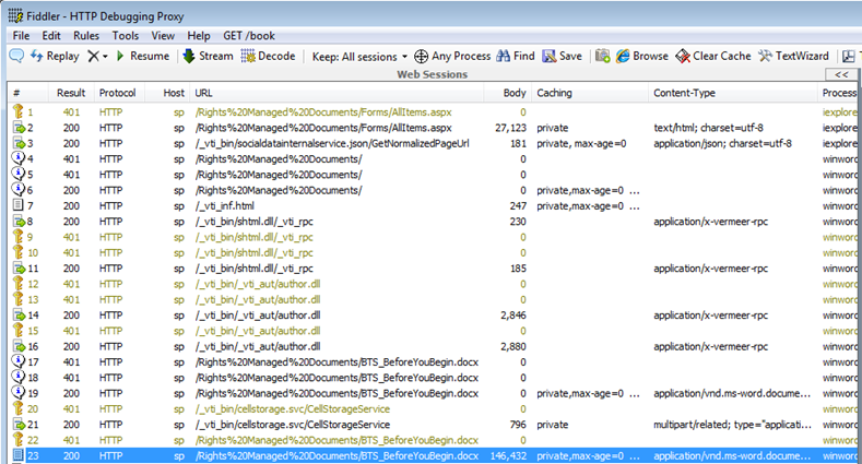 In this series of posts on SharePoint with RMS, I’ve mostly focused on the ways things might go wrong if Active Directory data, User Profiles and User Information Lists are misaligned. Now, assuming SharePoint has a reliable Work E-mail value for a user, there are still a number of things that happen between the initiation of a request for RMS-protected content and interaction with it. In this post I will inspect a successful request for RMS-protected content from SharePoint 2010.