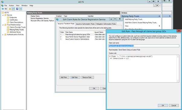 To add a bit more mud to the water, if we fast-forward the AD FS 2012 R2 TechNet article on Manage Risk with Conditional Access Control (which includes Authorisation Rules), there is a long list of, “the claim types available in AD FS in Windows Server® 2012 R2 to be used for implementing conditional access control”. What I find confusing is that we can always add Claim Descriptions beyond those listed here. These are just the default Claim Descriptions that ship with AD FS. We aren’t limited to making authorisation rules on this set. To make things a bit more confusing, if we look at page 34 of this Tech-Ed presentation, “Claims available for conditional access control”, the list is even smaller. In short, this is a red herring, but a confusing one if you’re trying to figure out why authorisation rules aren’t working.