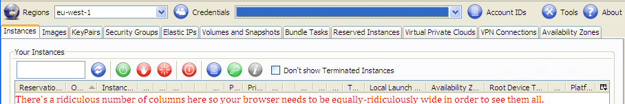 Unfortunately, the AWS Management Console user experience is fairly hideous. It doesn’t size properly in the browser and it has annoying synchronous post-back behaviours. It generally feels like an enormous Java app. I’m reminded of Cisco administration consoles circa the early part of this century. However, there is an Add-on for Firefox called ElasticFox which improves things a bit, but I wouldn’t say I’m thrilled with it either. I would classify it as less clunky, but I’d hesitate to go much further.