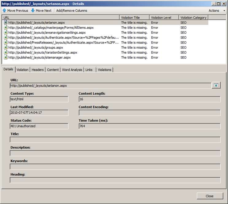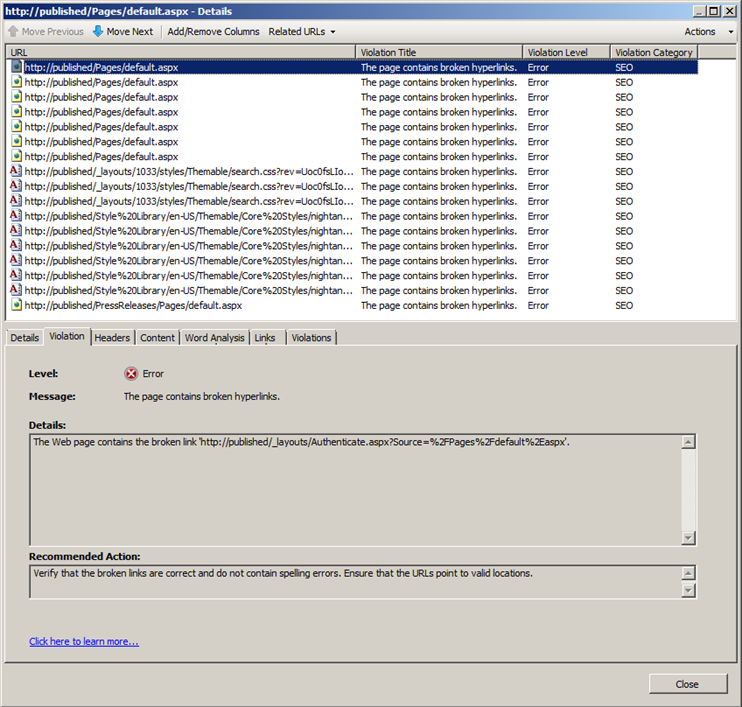 Unsurprisingly all of these errors point out fundamental problems in the site which content owners would want to correct even if they were unconcerned with page rank. The warnings, which I skipped over earlier, provide supplementary insight in to changes that can improve page rank in an otherwise functionally-correct website. Rather than discussing those individually, I’ll just include a screen shot of the Violations tab in the bottom half of the details pane. This tab summarises all of the violations on a selected page, which will improve the editor’s experience when making these changes.