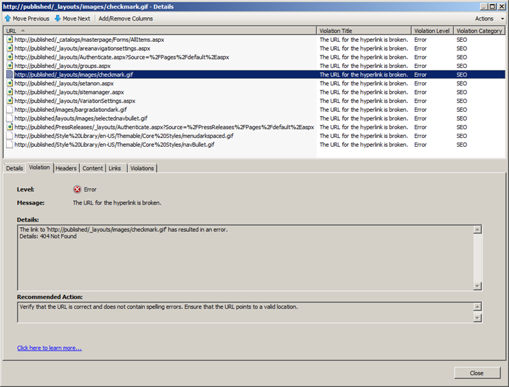 What’s particularly useful about this view is that it is now enumerating each page that violates the specified rule in the top pane, but the Violations tab enumerates all of the violations for the selected object in the top pane (the default home page in this instance).
