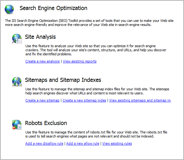 The SEO Toolkit home page looks like this.