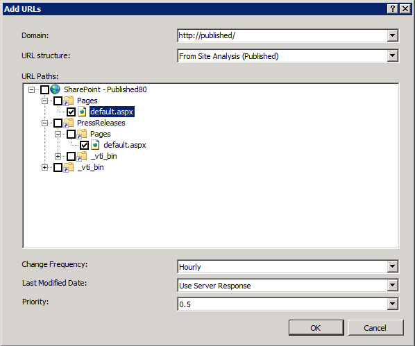 At the bottom of the dialogue the Change Frequency tells search engines how often pages are likely to change. The priority details how important we consider our site to be relative to other URLs on our site (I must confess I don’t fully understand how this works, but I’m not responsible for content. 🙂). You can also tell Search Engines how to identify the Last Modified Date. More information on all of this can be found on TechNet.