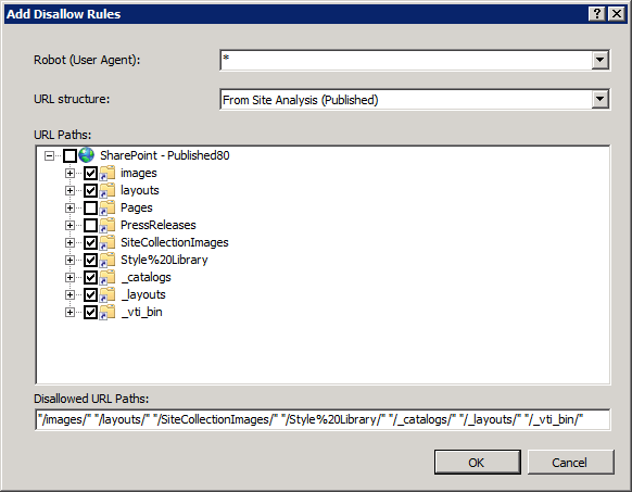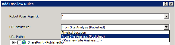 If we click Add Disallow Rules or Add Allow Rules we get a similar dialogue, and in both cases we will want to specify our previous Site Analysis for the URL structure.