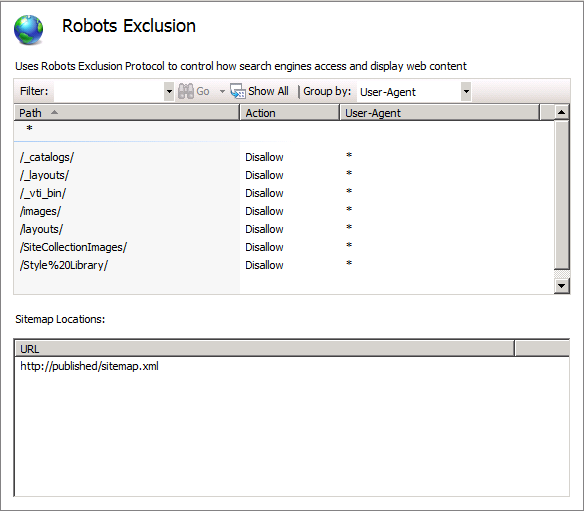 Also note, in the Related Features on the Actions pane, there’s a link to Robots Exclusion, which brings us to the final tool.