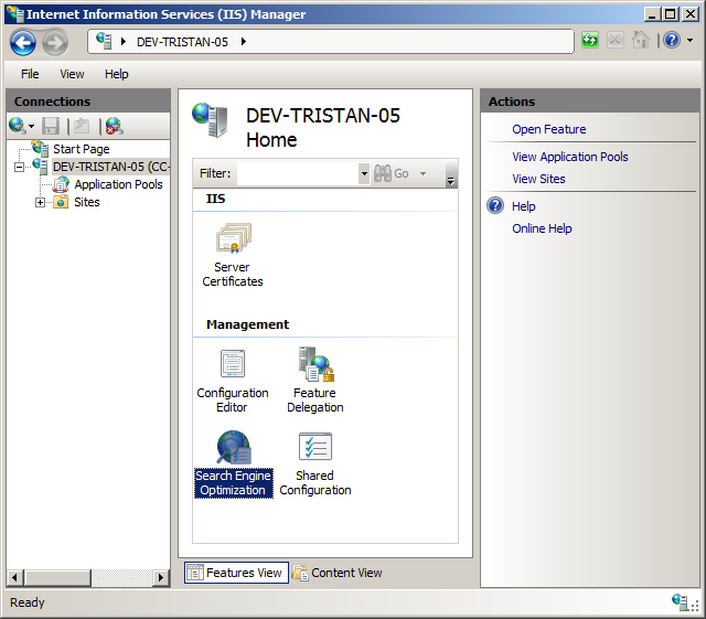 Click Next and Install. Wait for the Add Features Wizard to complete and then download and install the SEO Toolkit. IIS Manager is available in the Administrative Tools menu and should look something like this when you click on your local machine’s connection in the left-hand pane.