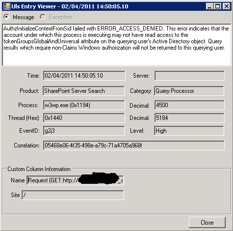 AuthzInitializeContextFromSid failed with ERROR_ACCESS_DENIED. This error indicates that the account under which this process is executing may not have read access to the tokenGroupsGlobalAndUniversal attribute on the querying user’s Active Directory object. Query results which require non-Claims Windows authorization will not be returned to this querying user.
