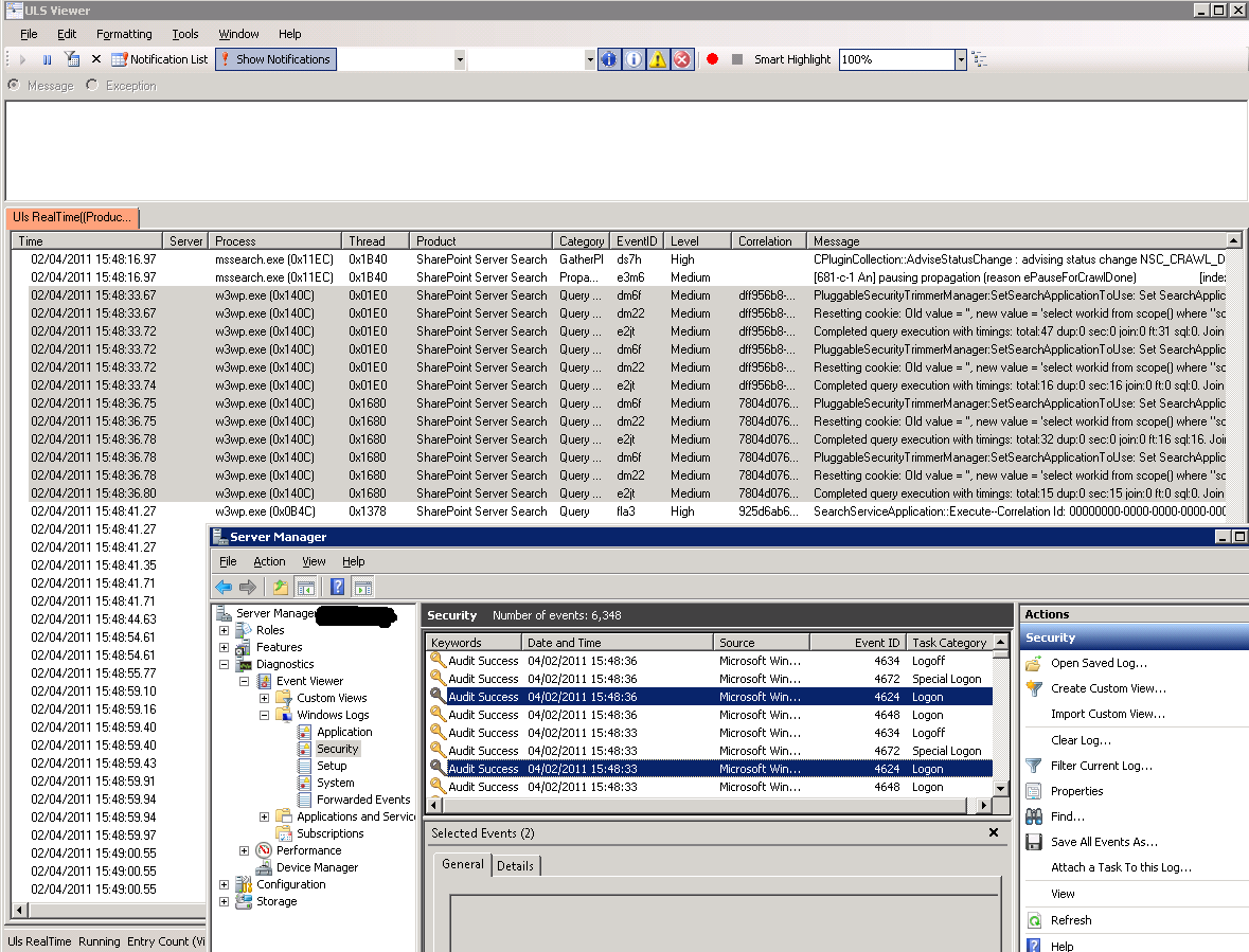 After running one more Full Crawl I confirmed that the ULS errors were also gone. It’s reasonable to infer from these new ULS events that when PluggableSecurityTrimmerManager is selecting, “workid from scope()”, it needs these Pre-Windows 2000 Compatibility Access permissions in a Windows Server 2000 or Windows Server 2003 domain. Presumably if SIDs can’t be initialised, everything gets security trimmed.