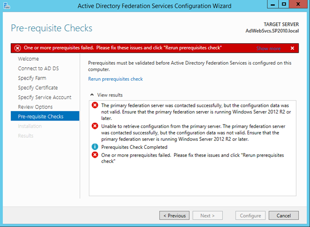 - Following that failure, I tried to join a new Windows Server 2012 R2 VM to my existing Windows Server 2008 R2 farm. This also failed, but the error did not emerge until the final step of the configuration. This is pretty clear to me.